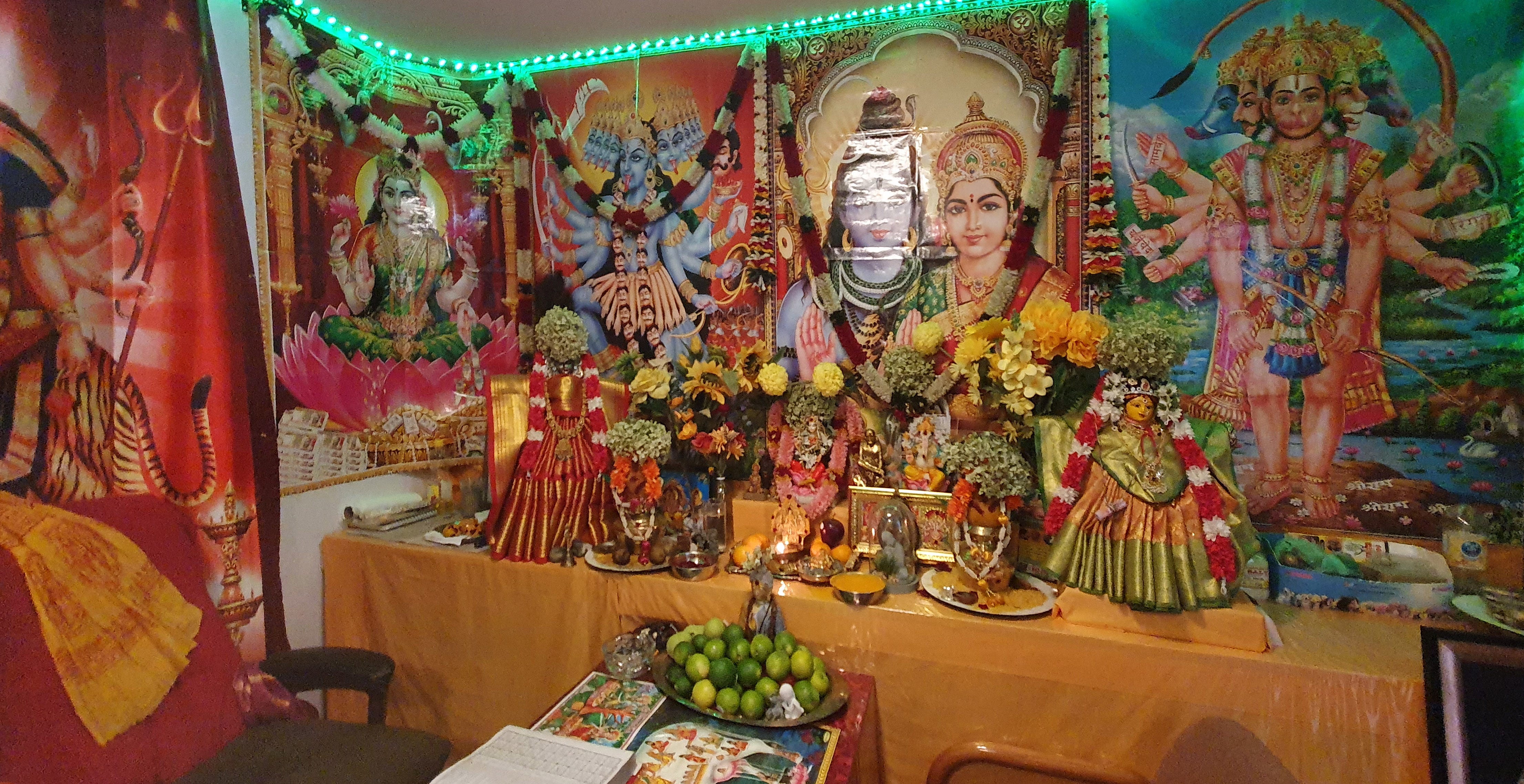 Un autre praticien est là, plus élancé. Impeccable aussi, mais en noir de la tête au pied. Le sanctuaire compense, couvert d’images bariolées de divinités diverses et rempli de statuettes mystérieuses. Beaucoup de coupes de fruits aussi, de fleurs séchées et de guirlandes. C’est du sérieux.