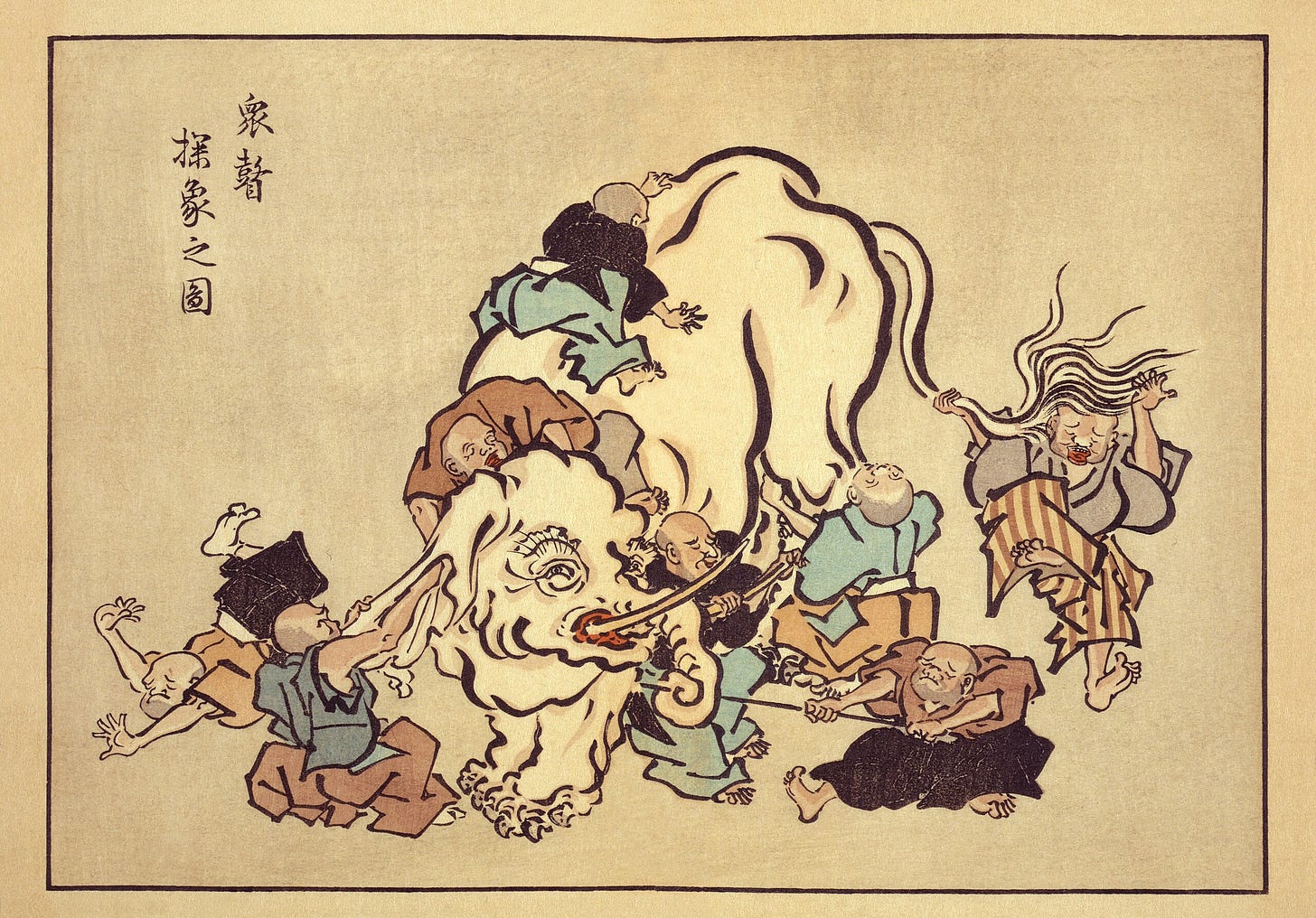 Elle commence un peu comme une histoire drôle de jadis, mais ce ne sont pas six aveugles qui rentrent dans un bar, ce sont six aveugles qui rentrent dans un éléphant. Ce qu’ils ne peuvent voir, ils peuvent le toucher. Celui qui l’a percuté de plein fouet n’a aucun doute : c’est un mur. Le suivant n’est pas d’accord : le contact d’une défense lui a prouvé qu’il s’agit d’une lance. Un autre touche la trompe : pas du tout, c’est un serpent ! Son voisin palpe une grosse patte rêche : c’est plutôt un arbre affirme-t-il. Celui qui agite l’oreille comprend que l’obstacle est en réalité un éventail. Mais le dernier tripote la queue et n’en démord pas : ils ont bel et bien affaire à une corde. Les esprits s’échauffent en vain.